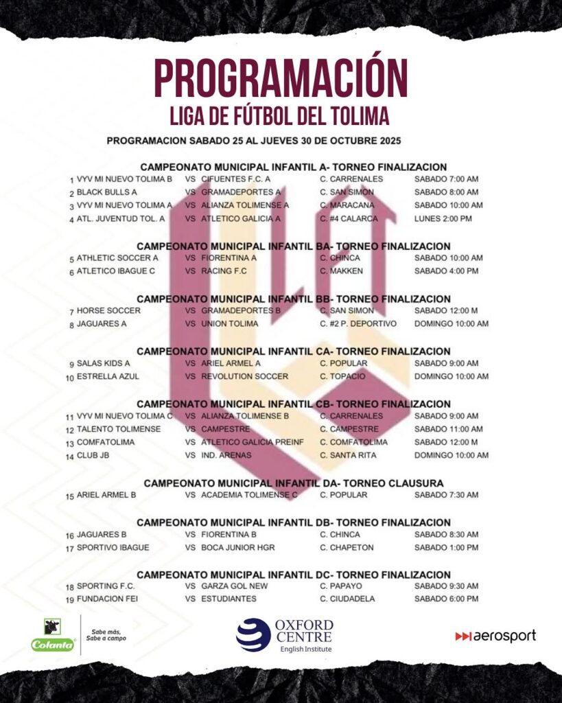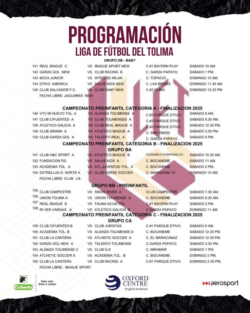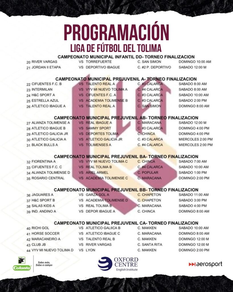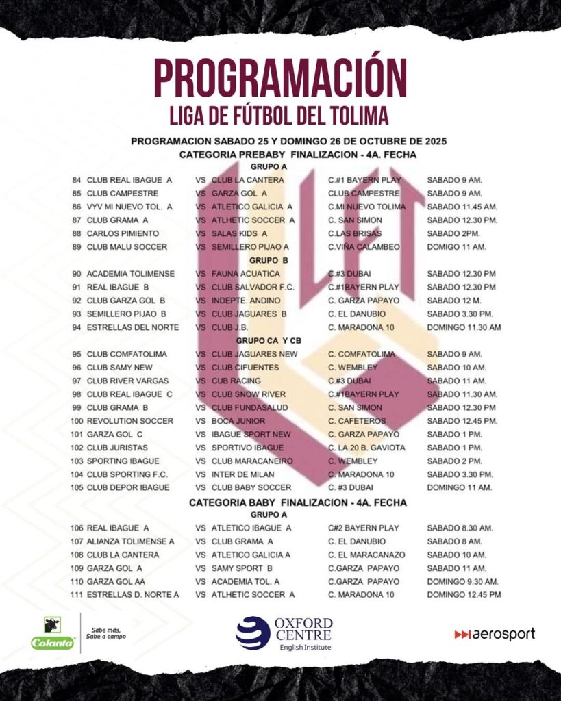Espijao.com y la Liga de Fútbol del Tolima traen la programación oficial para el fin de semana, sábado 25 y domingo 26 de octubre de 2025.