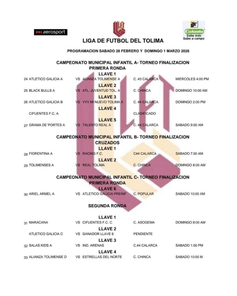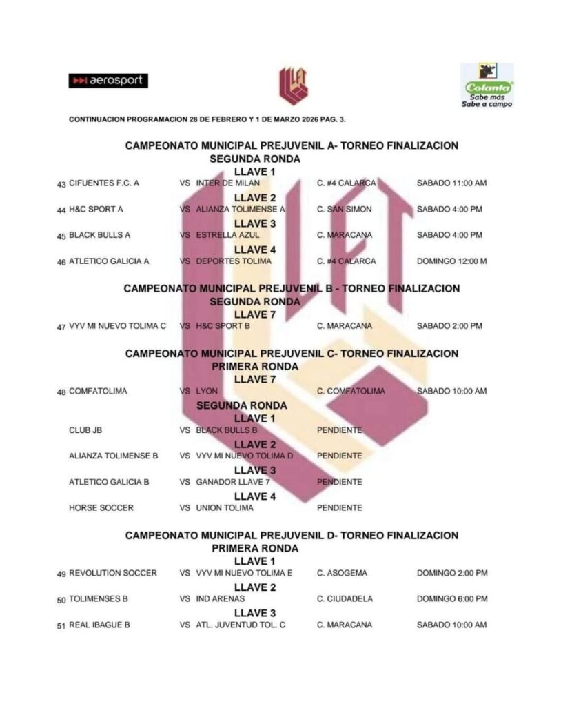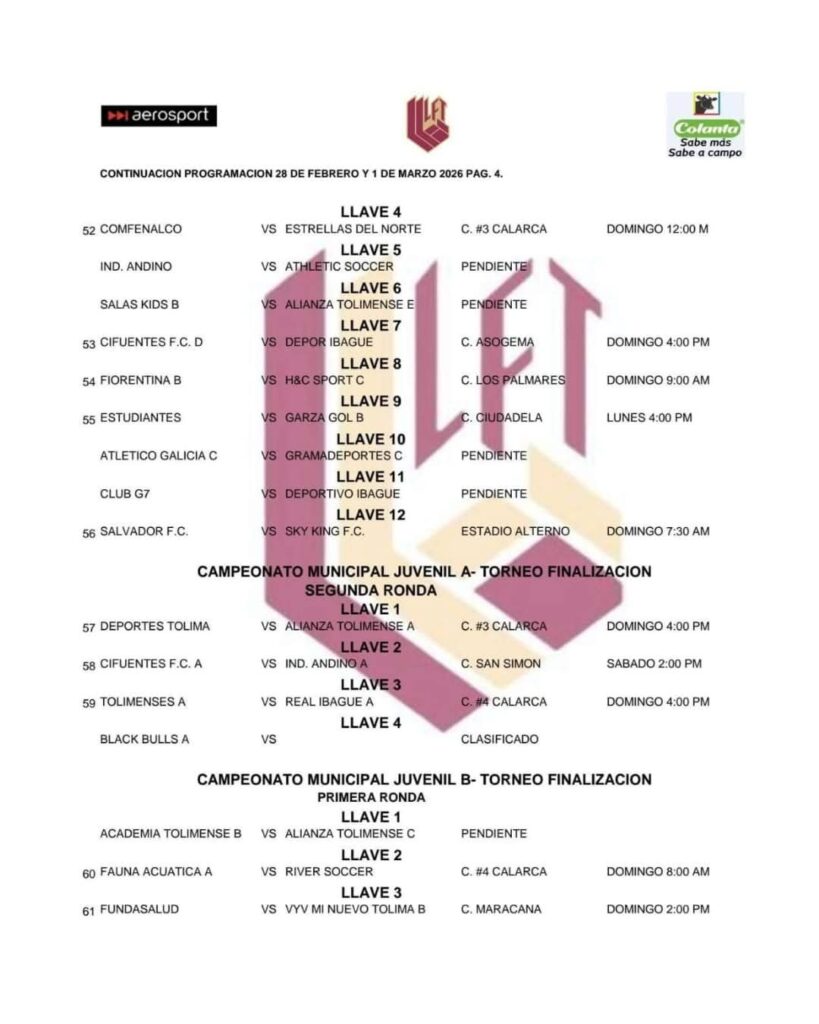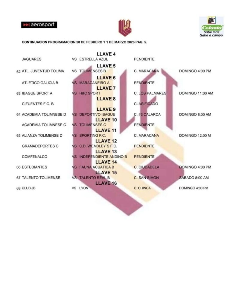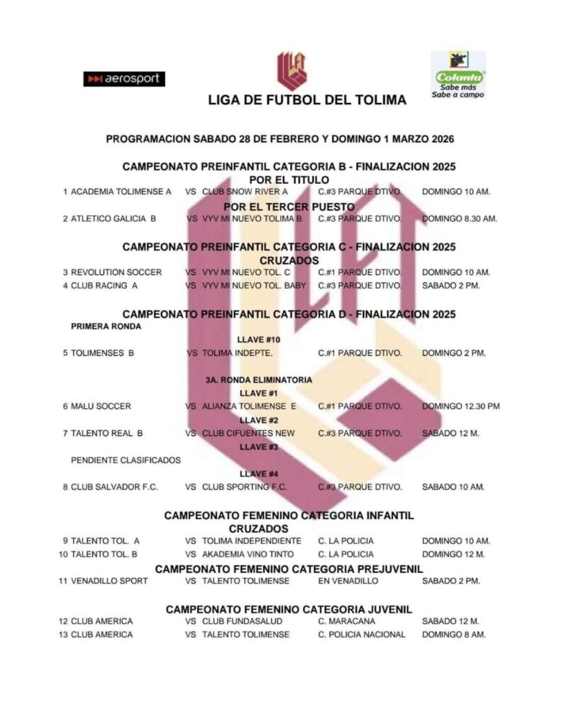 Espijao.com y la Liga de Fútbol del Tolima traen la programación oficial con todas las fechas, horarios y escenarios de este fin de semana, para este sábado 28 de Febrero y domingo 1 de Marzo de 2026.
